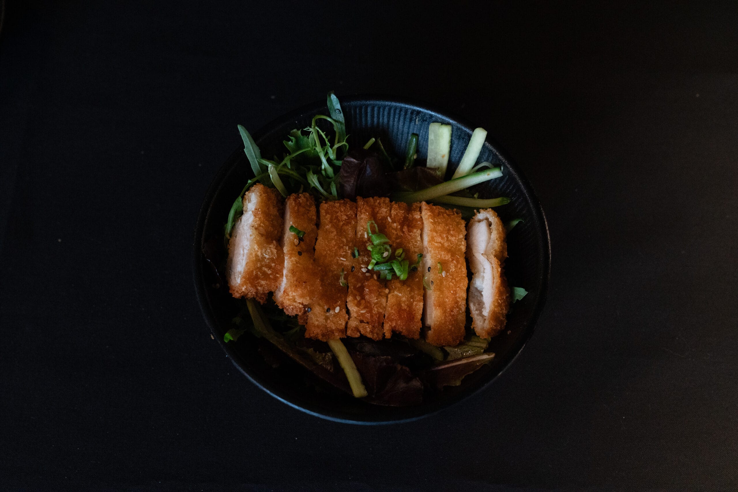 Unser Tonkatsu Salat kombiniert knusprig paniertes Hähnchen, verfeinert mit einer herzhaften Tonkatsu-Sauce, mit einem frischen Salat-Mix, Avocado und Gurke. Diese schmackhafte Mischung aus knusprigen und cremigen Texturen macht diesen Salat zu einem sättigenden und köstlichen Gericht.